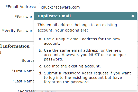 With ACEweb 3.5.060/4.0.060 and later, you can customize the pop up messages that display when users are creating a new account and enter an email address that is already assigned to a name record.