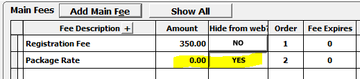 - Package2 Type - no fees are added to the 'parent' course. Instead each 'child' course has a fee with the desired discounted amount and fee description. If using ACEweb, you will also want to hide the package rate fee from the web. E.g.: