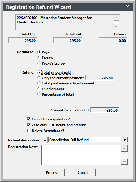 - If you chose the Proxy's Escrow, a note is entered into the canceled registration record with the name of the person who received the Escrow refund.