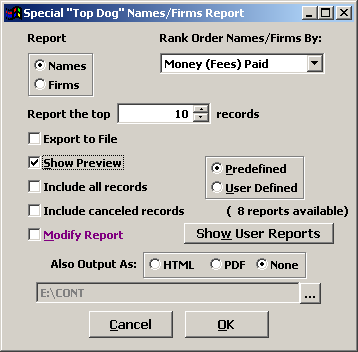 - Select Reports > Statistics > Names > Performance Sorting to open the Special "Top Dog" Names/Firms Report window.