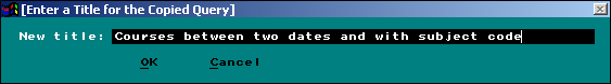 If you need a query that is similar to one already created, you can copy the existing query then edit it to include/remove query elements. For instance, you have a query which asks for courses between two dates for a specific coordinator. You also need a query which asks for courses between two dates for a specific department. You may copy the dates/coordinator query then change the coordinator field to department. This is often quicker and easier than creating a new query.
