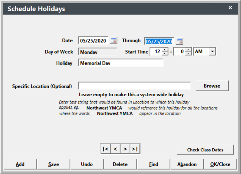 Holiday Dates are used in Courses to identify dates that courses will not be held. The system takes into account when calculating course ending dates and room scheduling. You may also set location specific holiday dates. Add/Edit Holiday Dates on File > New > Holiday or Module > Holidays > Add Holiday.