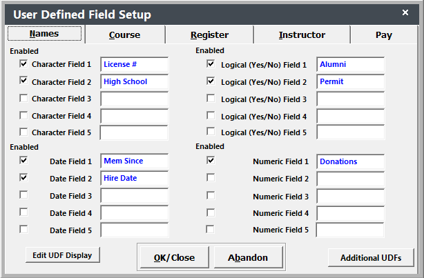 You can now set an unlimited* number of user defined fields (UUDFS) for the Names, Course, and Register tables.