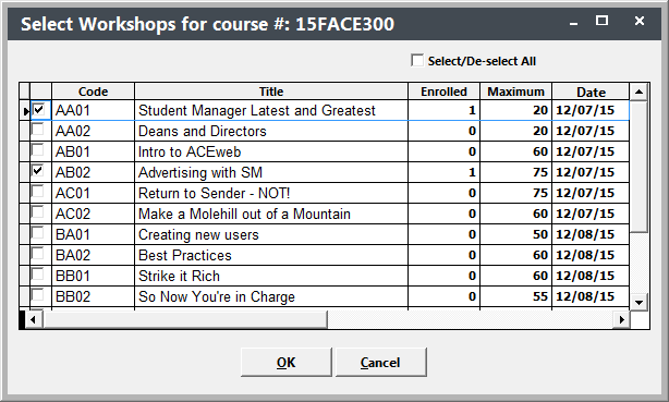 - Click the OK button to register the individual in the workshops and return to the Registration screen.