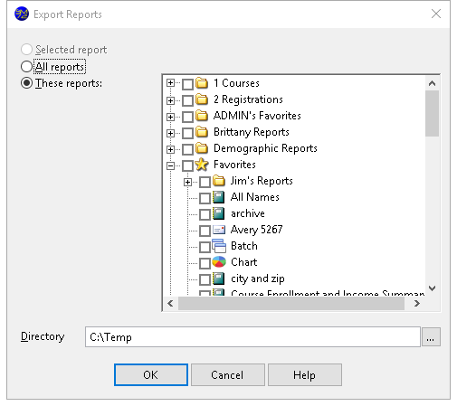 These reports: choose this item to indicate that you will select certain reports. The list of reports at the right is then enabled, allowing you to select which reports to export by turning on the checkmark in front of the desired report names. To select all of the reports in a folder, turn on the checkmark in front of the folder name; turning the checkmark off deselects all of the reports in the folder.